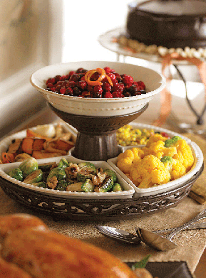 If you are serving food buffet style, make sure you add in plenty of height, color and texture to your table. Put down a base cloth, strategically place boxes, books or other sturdy items to provide height, then artistically drape another cloth on top. Make sure your centerpiece is the highest point on the table and place it off center. Your centerpiece can be something as simple as a hurricane with a candle and pinecones, a basket of leaves or nuts or a bouquet of seasonal flowers. If you have hot dishes that need to stay warm, heat bricks in the oven. Make sure you put a pot holder under the bricks so you don’t damage your table surface. You can drape a second cloth over the bricks to hide them. Aluminum or plastic pans filled with ice, and draped with a cloth, work well to keep cold foods cold. Use the colors of the season in your serving pieces or mix and match pieces in all one color – such as white or cream.