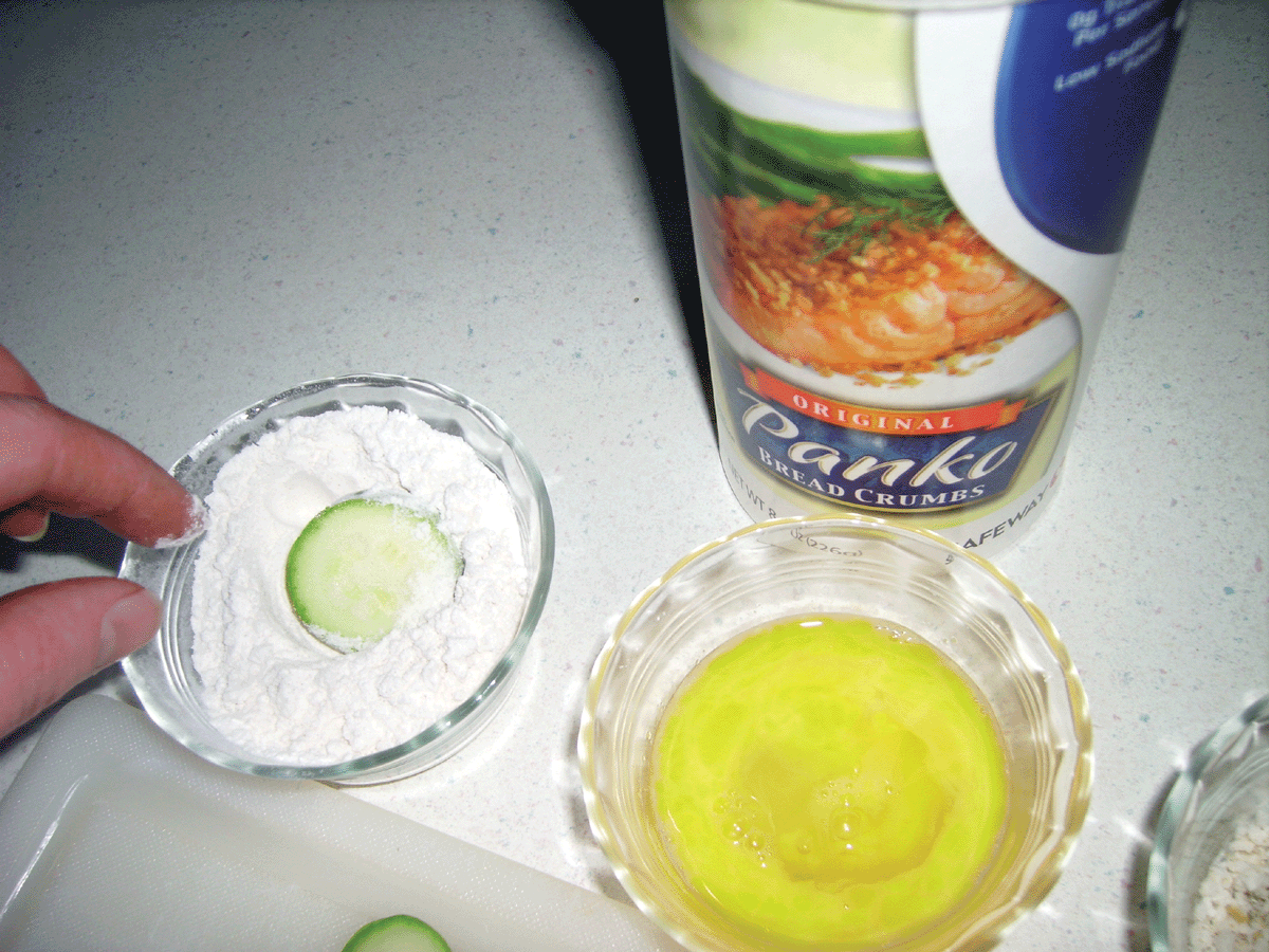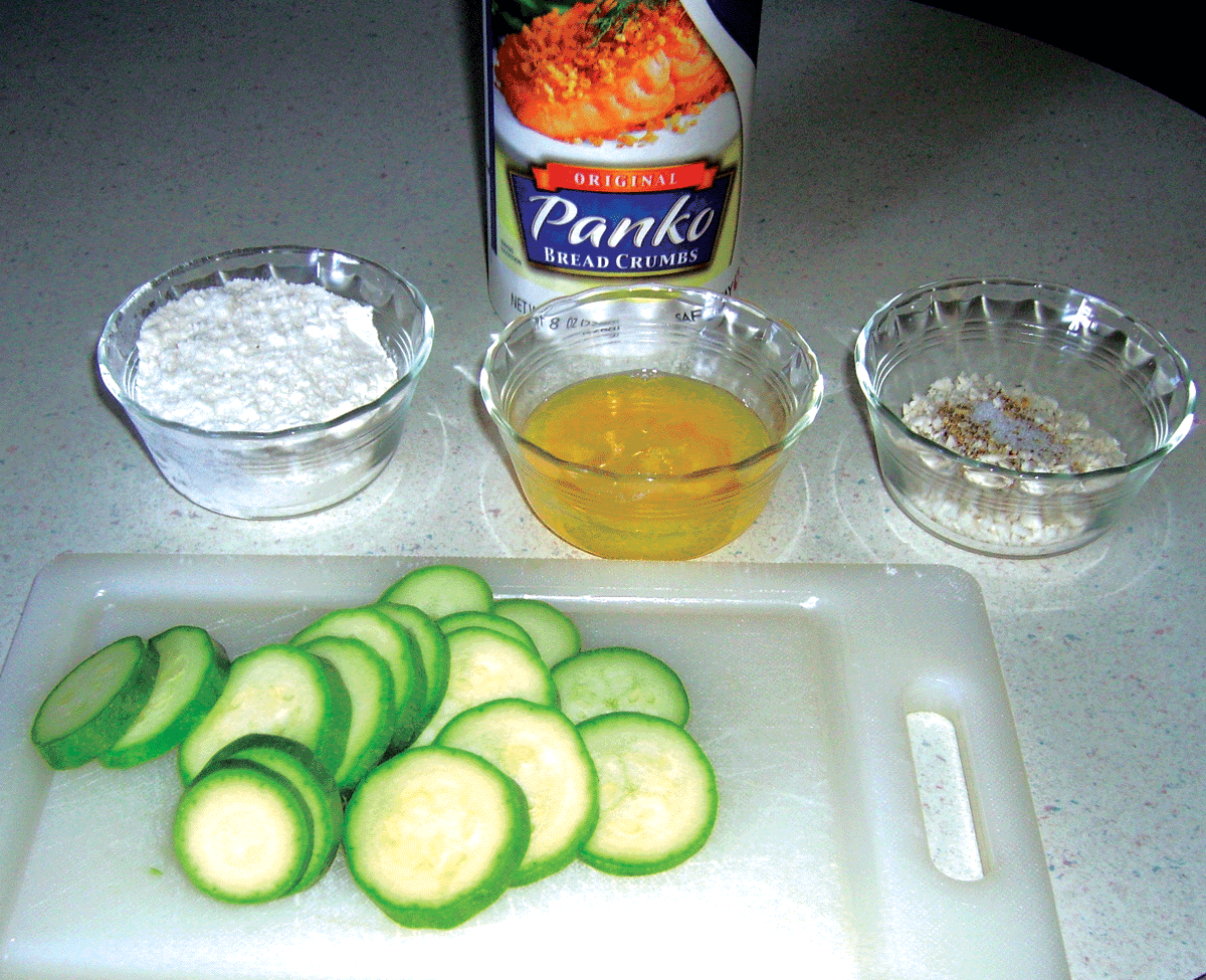 Heat a heavy skillet (I like cast iron) over medium heat with enough oil to cover the bottom. Let the oil get hot. While it is coming up to temp, wash and thinly slice your zucchini. Put your flour in one dish, the egg in a second and the Panko crumbs mixed with the seasonings in a third.
