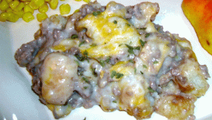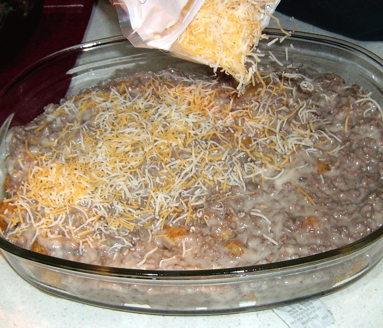 Preheat oven to 375 degrees. Put tater tots into a 9 x 13 casserole pan (I lightly spray mine with PAM first) and place in the oven while you brown the ground beef. I add the onion flakes, seasoning and salt and pepper to the ground beef. When the hamburger is browned, mix it with the two cans of cream of mushroom soup and spoon over the top of the tater tots. Layer on cheese and cover with foil. Bake for about 20 minutes or until soup is hot and bubbly. Remove foil and bake for a few more minutes until cheese is a melted layer of luscious gooey-ness. Remove from oven and serve. I like to sprinkle the top of my casserole with a bit of chopped parsley. Hubby likes his straight up “without any of that weird green stuff on there.”
