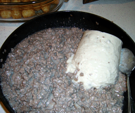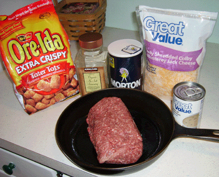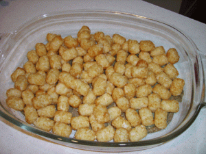 While you brown the ground beef, put the tater tots in a casserole dish in the oven and start getting them warmed up.