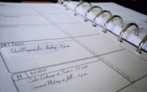 Let’s start by looking at your calendar, organizer or day planner. Pull out all those post-it notes with dates and appointments scribbled on them and start entering them into your calendar. The idea is to get everything into one calendar so you can see at a glance what days you have appointments and commitments and what days you have open. Think about everything coming up in the next month like church programs, rehearsals, the kids’ school concerts, any parties or gatherings you will be attending, any doctor appointments, hair appointments, manicures and pedicures (if you are so lucky!) and so on. Get all those dates entered into your calendar.
