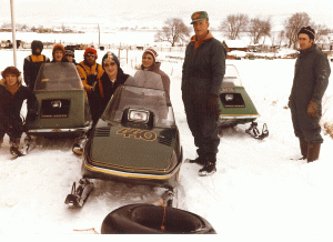 This photo, circa early 1980s (yes, laugh all you want), shows us gathered around enjoying a day of sledding and snowmobiling fun.