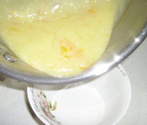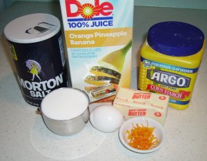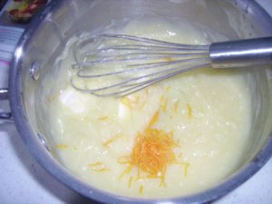 You'll mix sugar and cornstarch then whisk in orange juice and an egg before cooking over medium heat until thick. Remove from heat and whip in butter, salt and orange zest.