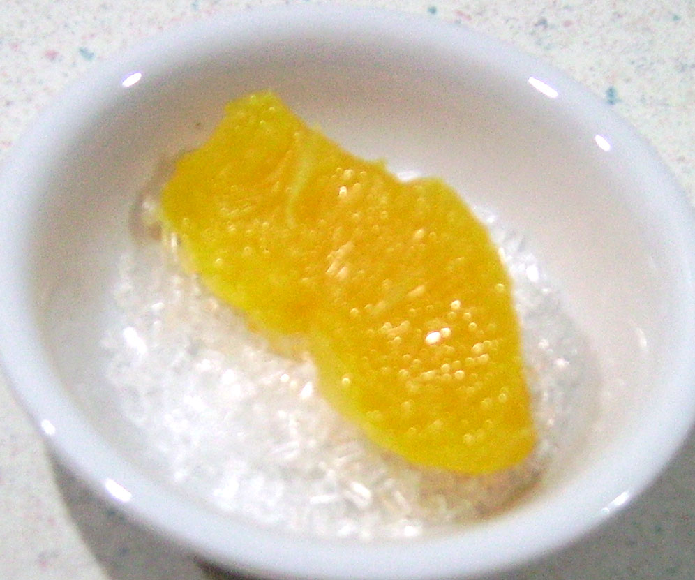 Peel and section remaining oranges. Make sure you have removed all the peel and bitter white pith. Roll orange sections in sparkling sugar.