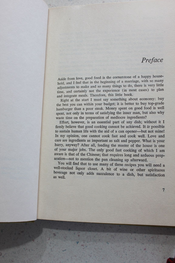 The book starts out saying, “Aside from love, good food is the cornerstone of a happy household…”