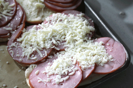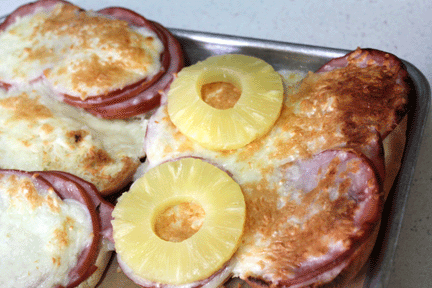 How much of each ingredient is really dependent on how many sandwiches you are making and how much stuff you want on each one. For me, I use three slices of Canadian bacon and one pineapple ring with a sprinkling of cheese. Hubby’s sandwich on the other hand features eight slices of bacon, three pineapple rings and we won’t discuss the cheese. At all.