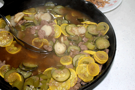 Add beef broth and simmer until veggies are tender. Thanks Captain Cavedweller for pouring in the broth so I could take photos!