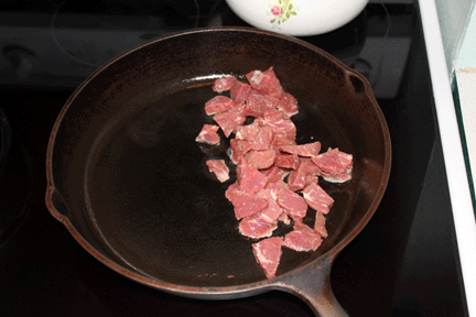 Brown your meat in a hot skillet. I got out my Big Bertha cast iron skillet so it could hold all the ingredients easily.