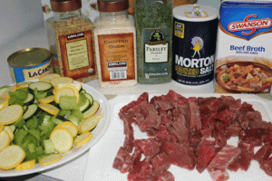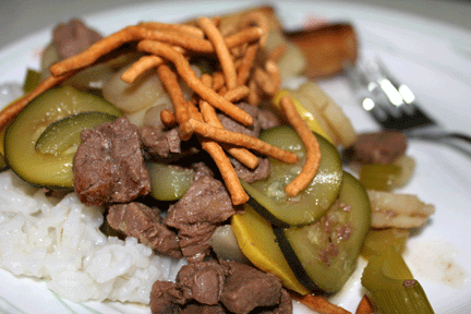 Brown meat in a skillet on medium-high heat. When browned, add in veggies and enough beef broth to cover the mixture. Cover and reduce heat to medium. Simmer until veggies are tender. Serve over rice. We like to sprinkle chow mein noodles on top. You can use any combination of vegetables. Onions and peppers and I are not on speaking terms, so we make do with onion flakes.