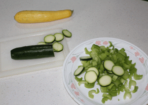 Wash and slice up vegetables. We used celery, zuchinni and yellow squash. You could also use broccoli, cauliflower, peppers, onion, corn, etc.