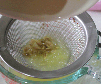 Go ahead and juice those lemons. I used three and it came out to be right at a 1/2 cup of juice. Run the juice through a strainer before using to get out all the pulp and seeds. Squeezing them by hand is great therapy!