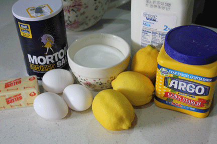 Here are the ingredients for the pudding. You will also need cream of tartar and 1/2 cup of sugar for the meringue as well as a pre-baked pie crust for the pie.