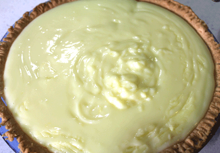 Remove pan from heat and stir in lemon juice and butter. If you don’t want the zested lemon in your pudding you can run it through a fine mesh strainer at this point. If you are like me and don’t care, pour the pudding into the prepared pie crust. You can make your own crust – I highly recommend the vodka pie crust recipe – or use a store-bought crust. Whatever floats your boat. Mine floated with the vodka recipe.