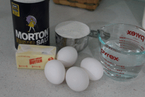 In a medium saucepan over medium heat, combine butter and water and salt. Bring to a boil. Add flour all at once, stirring vigorously. Cook and stir until mixture forms a ball that doesn’t separate. Remove from heat. Cool 10 minutes. Add eggs, one at a time, beating with a wooden spoon after each addition until smooth.