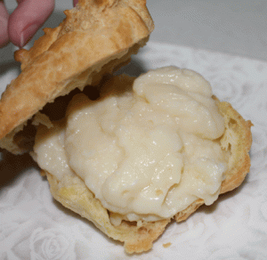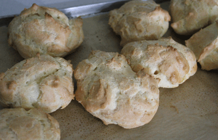 Drop batter by heaping tablespoons, three inches apart, on a greased baking sheet (I lined mine with parchment). Bake for 30-35 minutes or until golden. Cool on a wire rack. Split puffs and remove any soft dough from inside . Fill with pudding, dust with sugar, serve and enjoy. You could also fill with whipped cream, ice cream, sherbet or fruit.