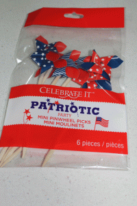 I loved this mini patriotic pinwheels. What I’m going to do with them exactly I don’t know, but the possibilities are so exciting! You could tuck them in a salad or dessert for a fun accent. Put a piece of rectangular florist foam in a long container, cover the top with moss, then poke in stems of red,white and blue flowers and use these little gems for a final accent for your centerpiece. Use them to mark dishes that are extra hot or spicy.