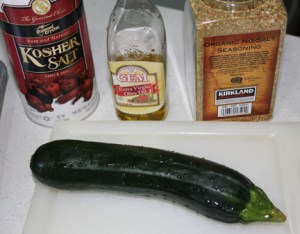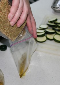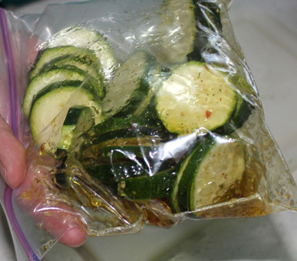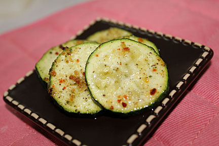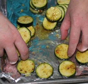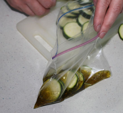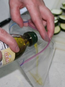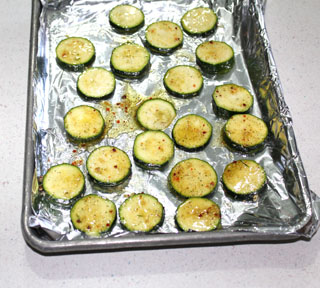 Pour a tablespoon or two of oil into a ziploc bag. Sprinkle in a dash of salt and some seasoning. Put in zucchini slices, seal and shake bag to coat slices. Place slices on a baking sheet and bake at 400 degrees for about five minutes. Serve and enjoy!