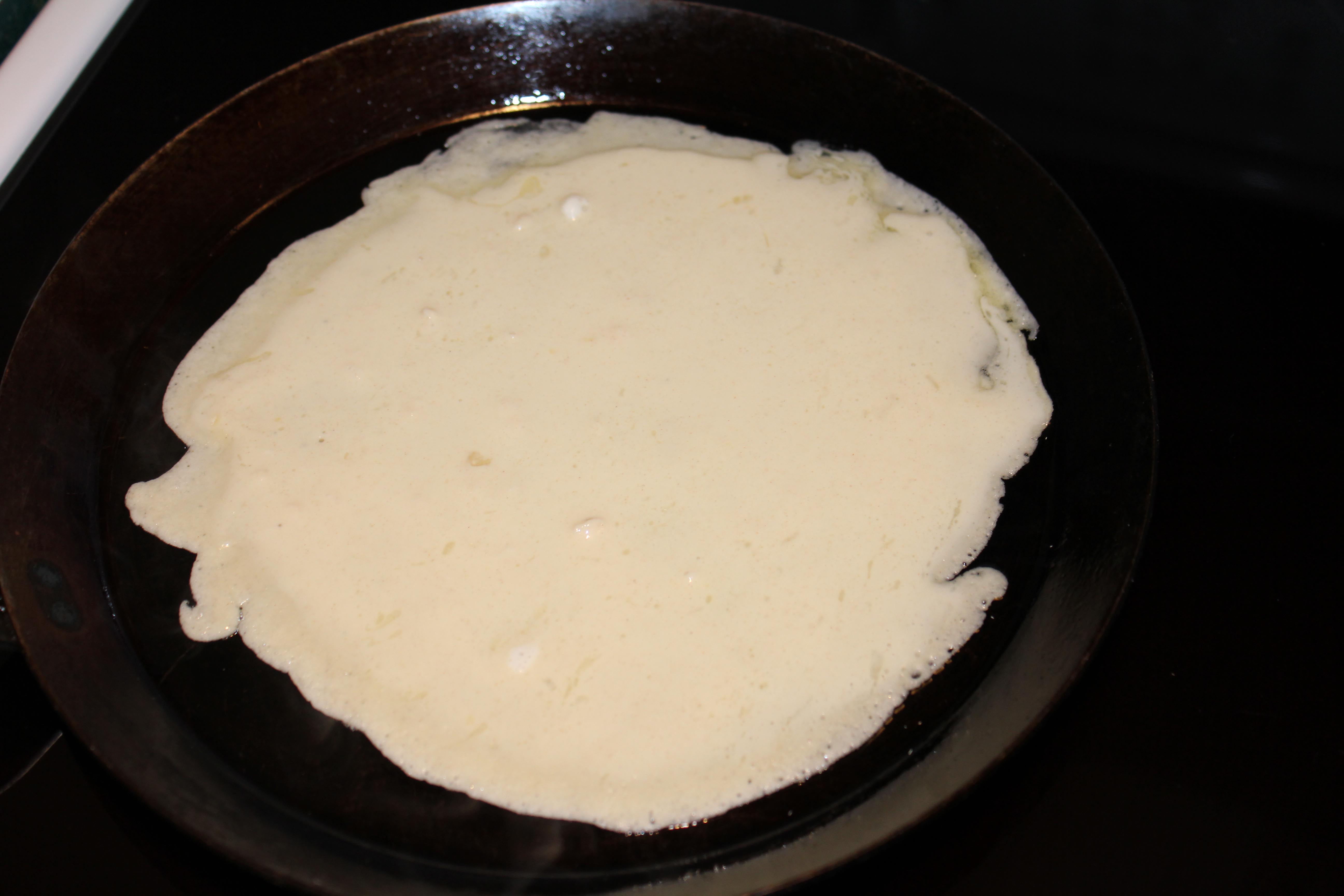 Lightly oil a hot griddle, frying pan or (if you have one) a crepe pan. Pour about two tablespoons of batter in the pan and thin it out by swirling the pan around. Tip and rotate until the batter is as thin as possible. Cook until each side is a light, golden brown.