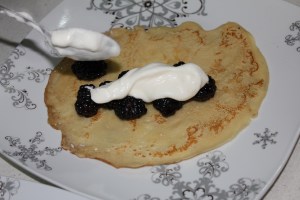 I’ve had this recipe for crepes since I was in the seventh grade. Our teacher decided to give us all some culture and let each of us a select a country to study up on and do a presentation complete with props. While I got stuck with India (when you are next to the last to get to choose, there aren’t a lot of countries left!), one of the girls choose France. Her mother brought in a hot plate and helped her make crepes for the class. They were delightfully wonderful and so different from anything I’d eaten. When she passed out copies of the recipe, I immediately went home and begged my mom to let me make them. She did and I’ve been making them sense. Although my dad always called these flat pancakes, Captain Cavedweller does enjoy them!