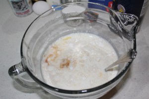 Combine dry ingredients and set aside. Beat eggs until broken down. Add milk and vanilla extract and beat well. Beat in flour mixture until mixed then add in melted butter.