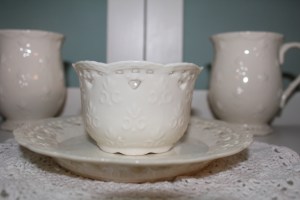 Like these plates. The one on the far left is from a Mikasa set Captain Cavedweller bought for me. The one next to it and the one on the far right are both from Willow House (formerly Entertaining at Home), the direct selling company I was proud to be a part of for several years. The dish with the delicate little flowers is part of a set my grandpa bought for my grandma way, way back when.