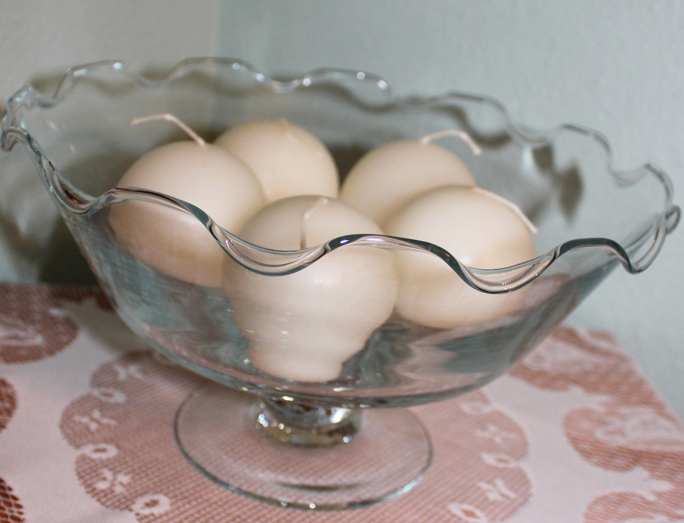 Creamy, snowball shaped candles nestled well in a clear glass bowl. I love the fluted edges on this serving piece and I use it for decor purposes as much as I do for serving food.