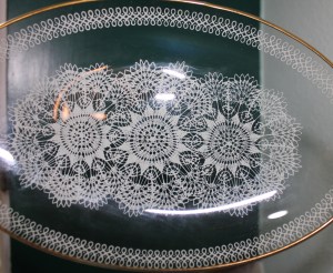 This plate was a gift several years ago from my niece, Miss Molly, when she was still in school. I love the beautiful lace etching on the clear glass.