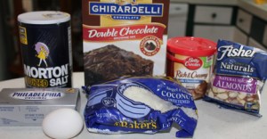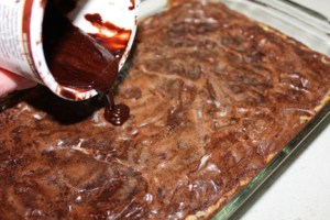 Microwave about 1/2 to 2/3 cup of the frosting for 10 seconds and pour over cooled brownies. Top with sliced almonds and serve.