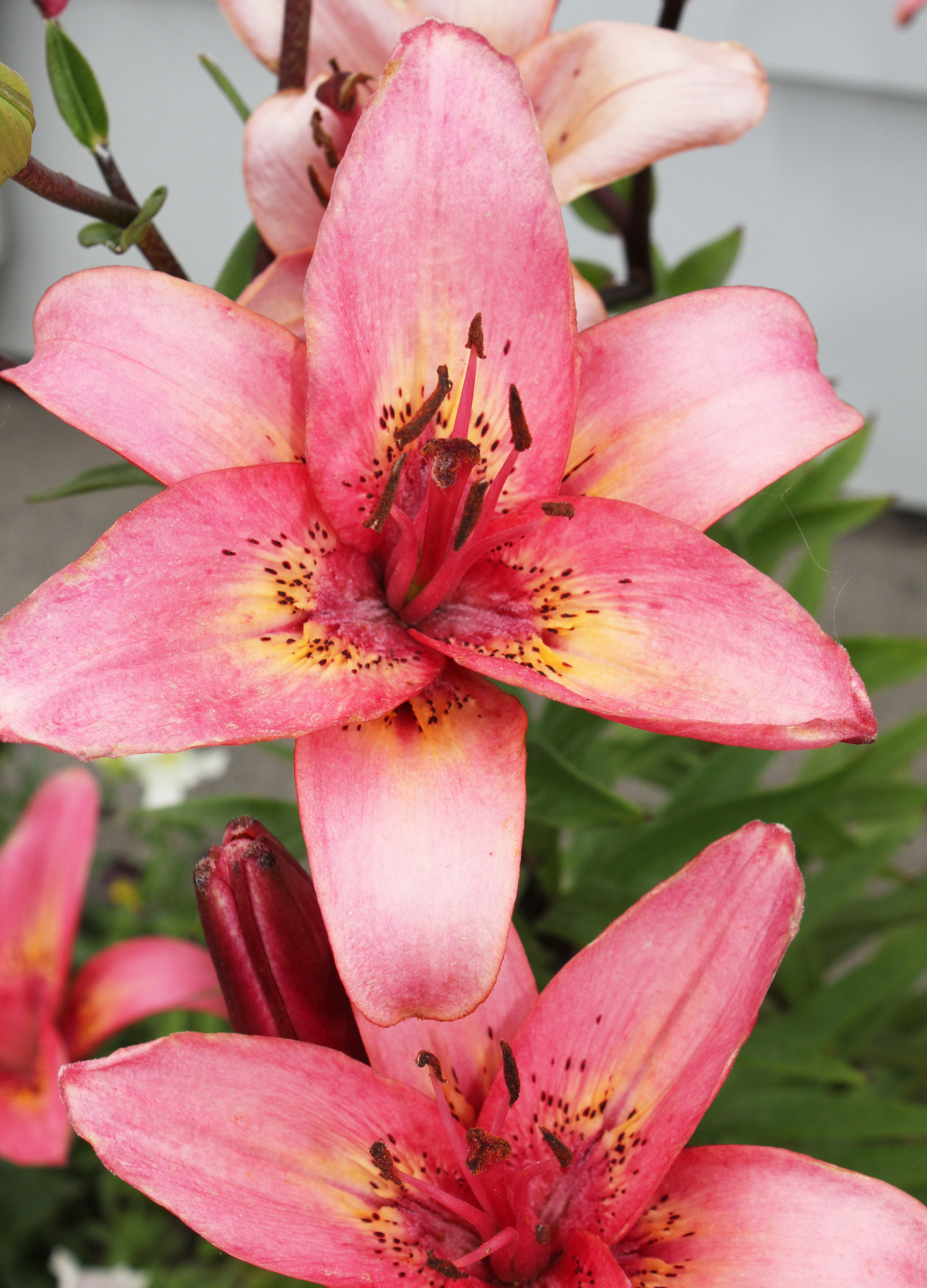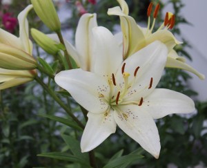 But the other day I happened to glance into the front flower bed and came to an abrupt halt. It’s where the lilies bloomed. In profusion. In lovely, stately shades of color. In splendor, despite the month-long disruption by back hoes and dirt and trucks full of gravel.