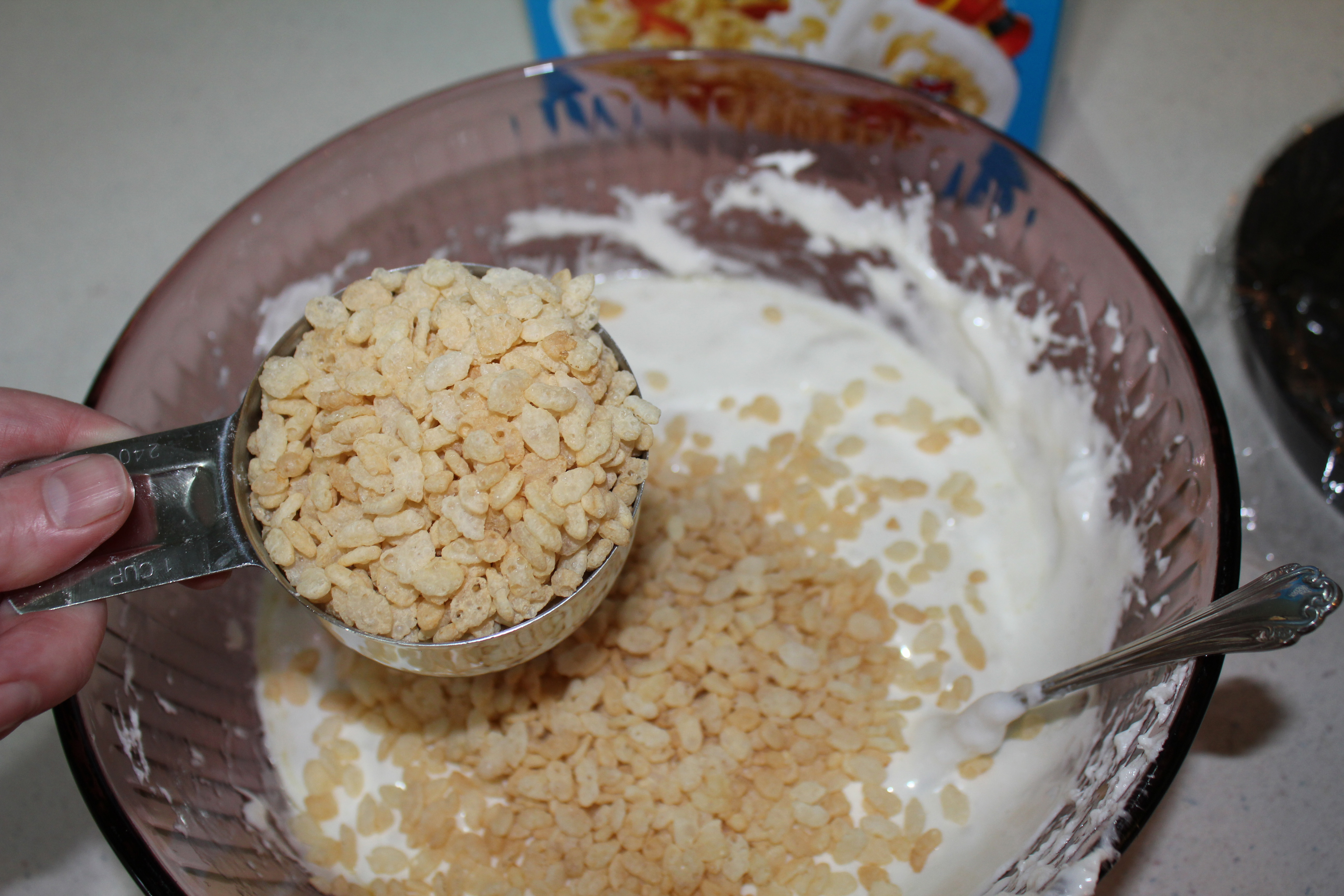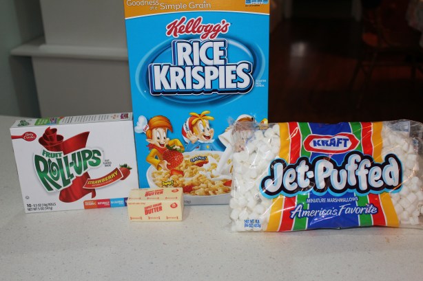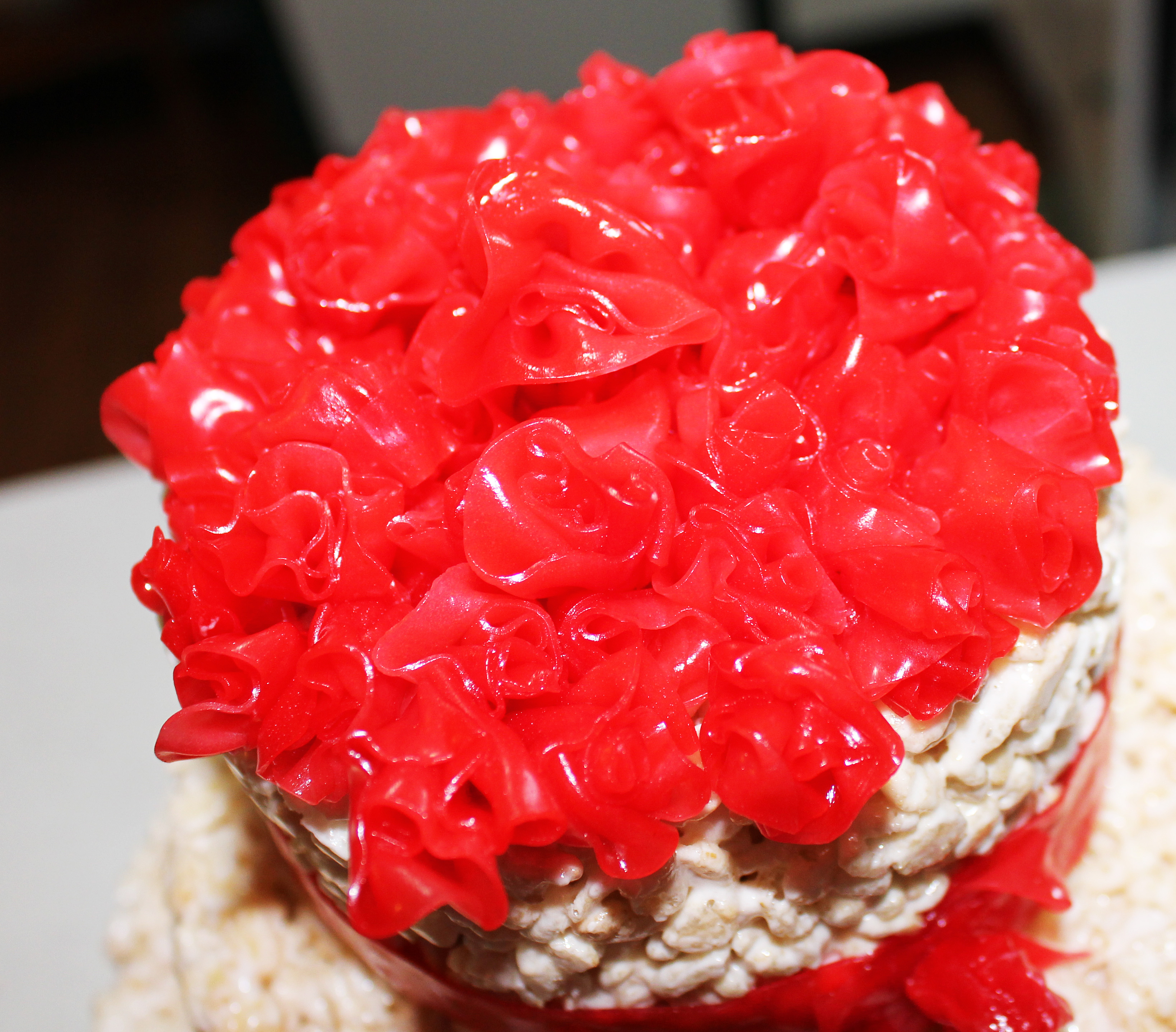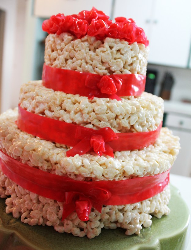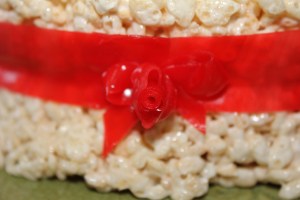I was asked to bring dessert to a bridal shower the other day. The bride-to-be mentioned one of her favorite things to eat was Rice Krispies Treats. So I decided to make her a “wedding cake” out of Rice Krispies Treats with Fruit Roll-Ups for the trim.