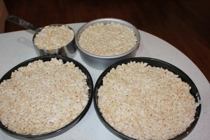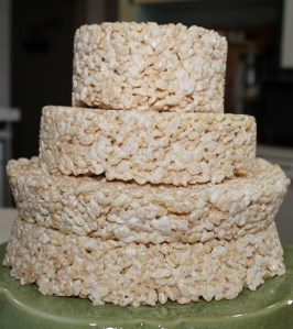 Place your bottom layer of your “cake” on your serving dish upside down. Put the second half of the bottom layer directly on top and face right side up. Add the middle layer and the top. The treats are sticky enough, they will hold together without worrying about them wiggling around.