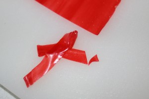 On a cutting board cut into 1/2 strips for the ribbon around the cake. Because these are sticky, they are easy to layer the ends to make the ribbon as long as you need. I pieced them together as I placed around the cake. I used them to hide the layers.