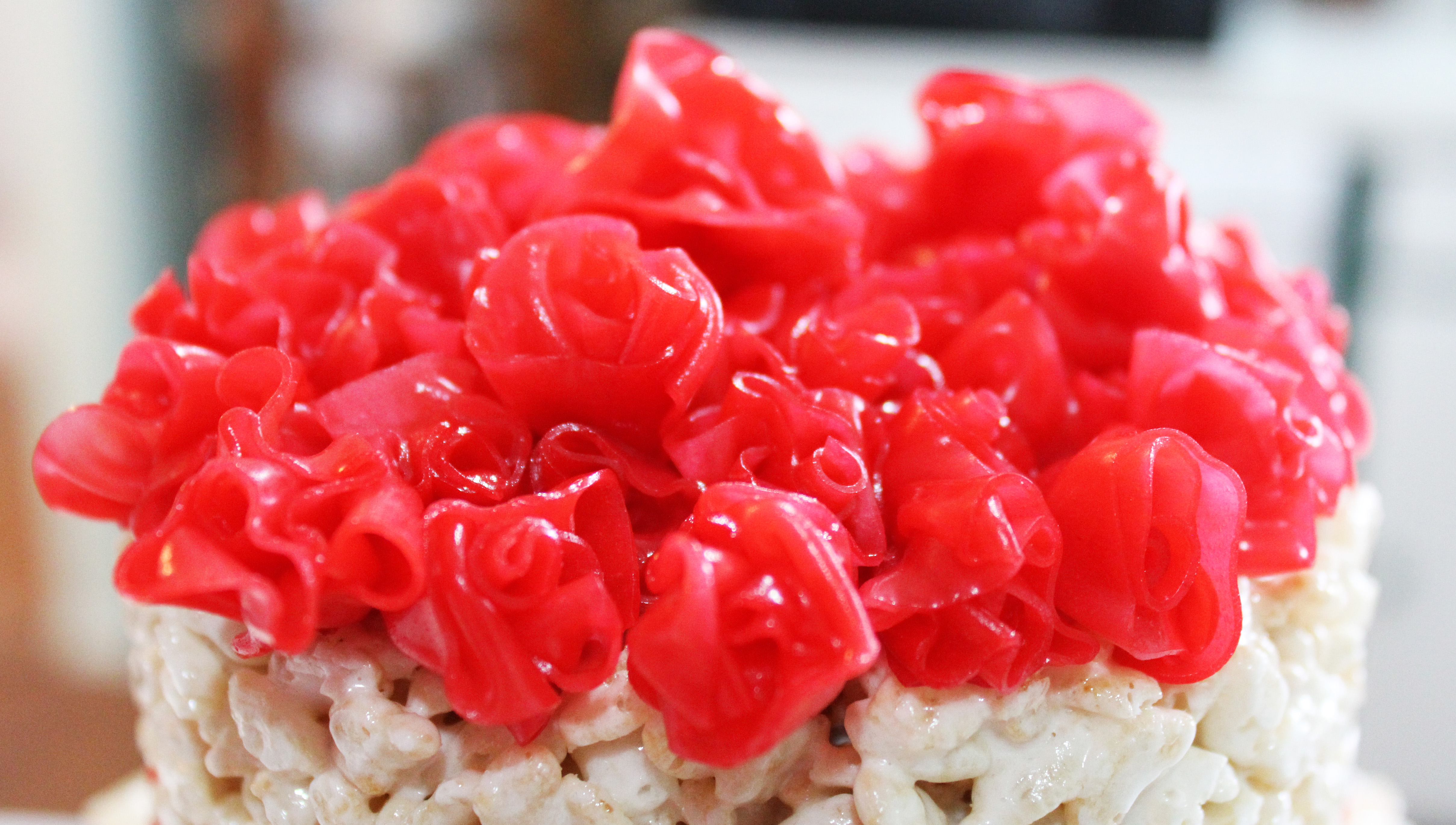 Make your rosettes out of Fruit Roll-Ups. Cut a strip and start winding it around until it looks like a sweet little rose bud.
