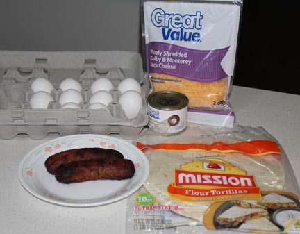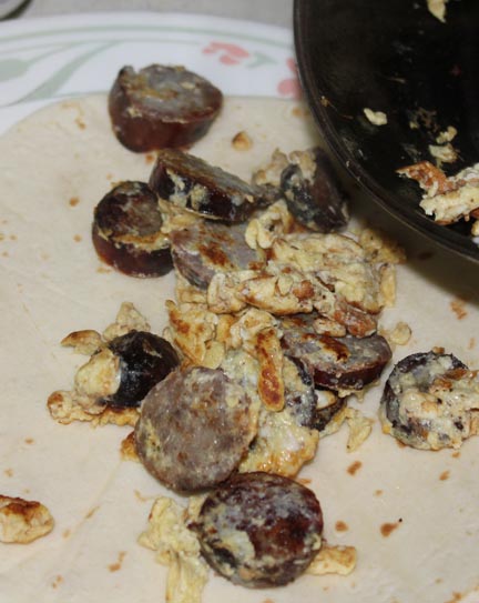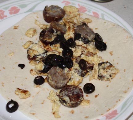 Thinly slice sausage and warm in a skillet on medium heat. Whisk eggs with milk and seasoning then pour over sausage. Scramble until eggs are set. Scoop into a flour tortilla and top with olives and cheese. This will make three burritos (or two really big ones).