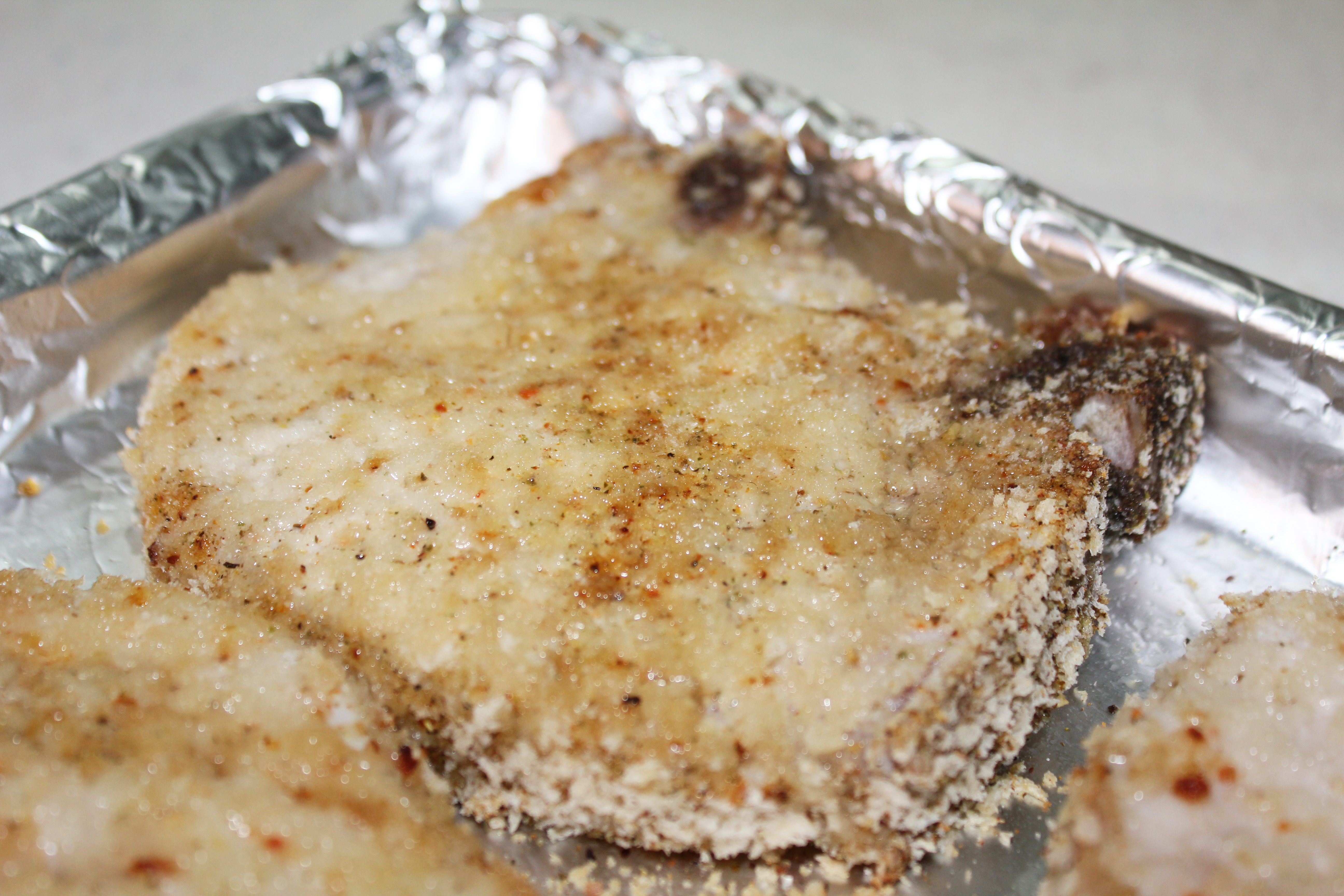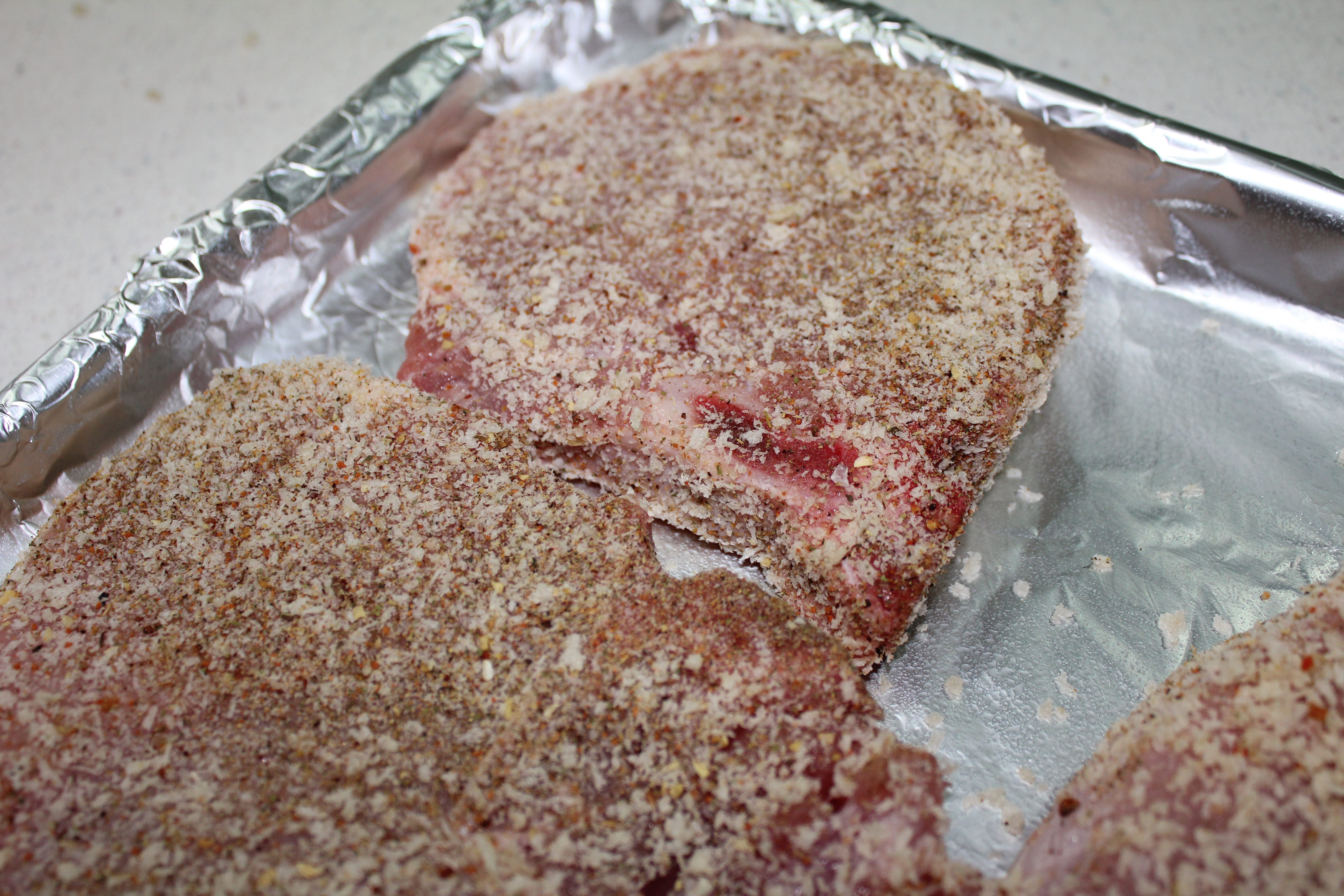 Mix seasonings, crumbs and salt in a resealable bag. Shake until blended. Add in pork chops, one at a time to coat. Shake well then place on foil-lined pan. (The foil is because I’m lazy and don’t want to scrub the pan later).