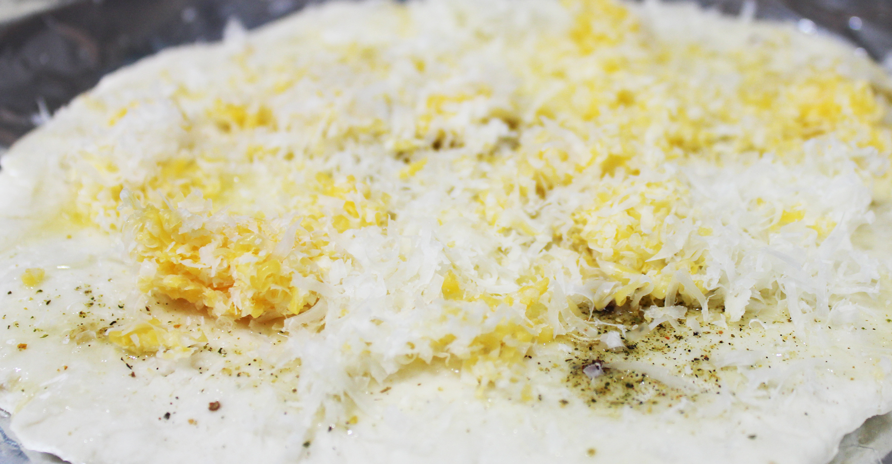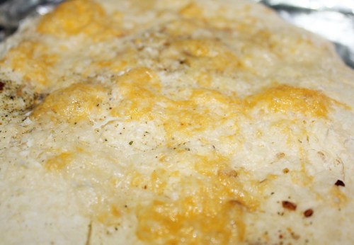 Knead dough 60 times (I did this right in the bowl and didn’t want to clean up a mess on the counter. Lay down a piece of foil or parchment on the counter, place dough on top and roll out until about 1/2 thick. Transfer foil onto a baking sheet. Drizzle dough with butter, sprinkle with cheese, seasoning and salt and bake for about 10 minutes, until the bread begins to brown.