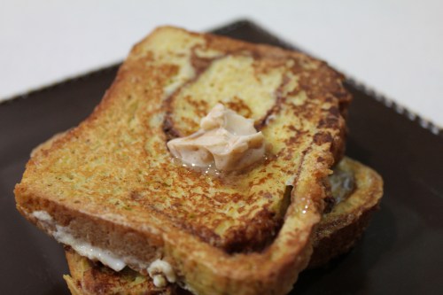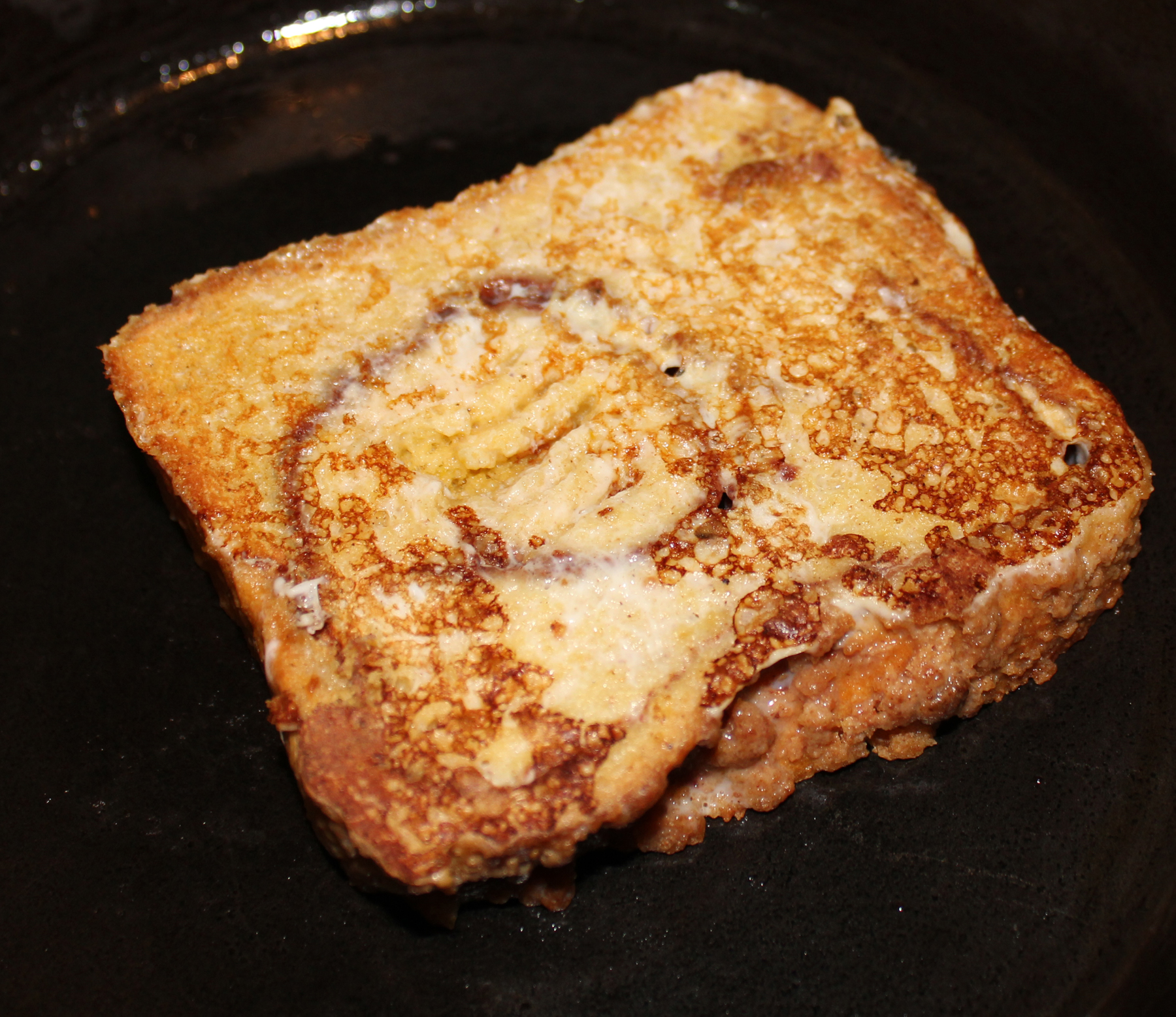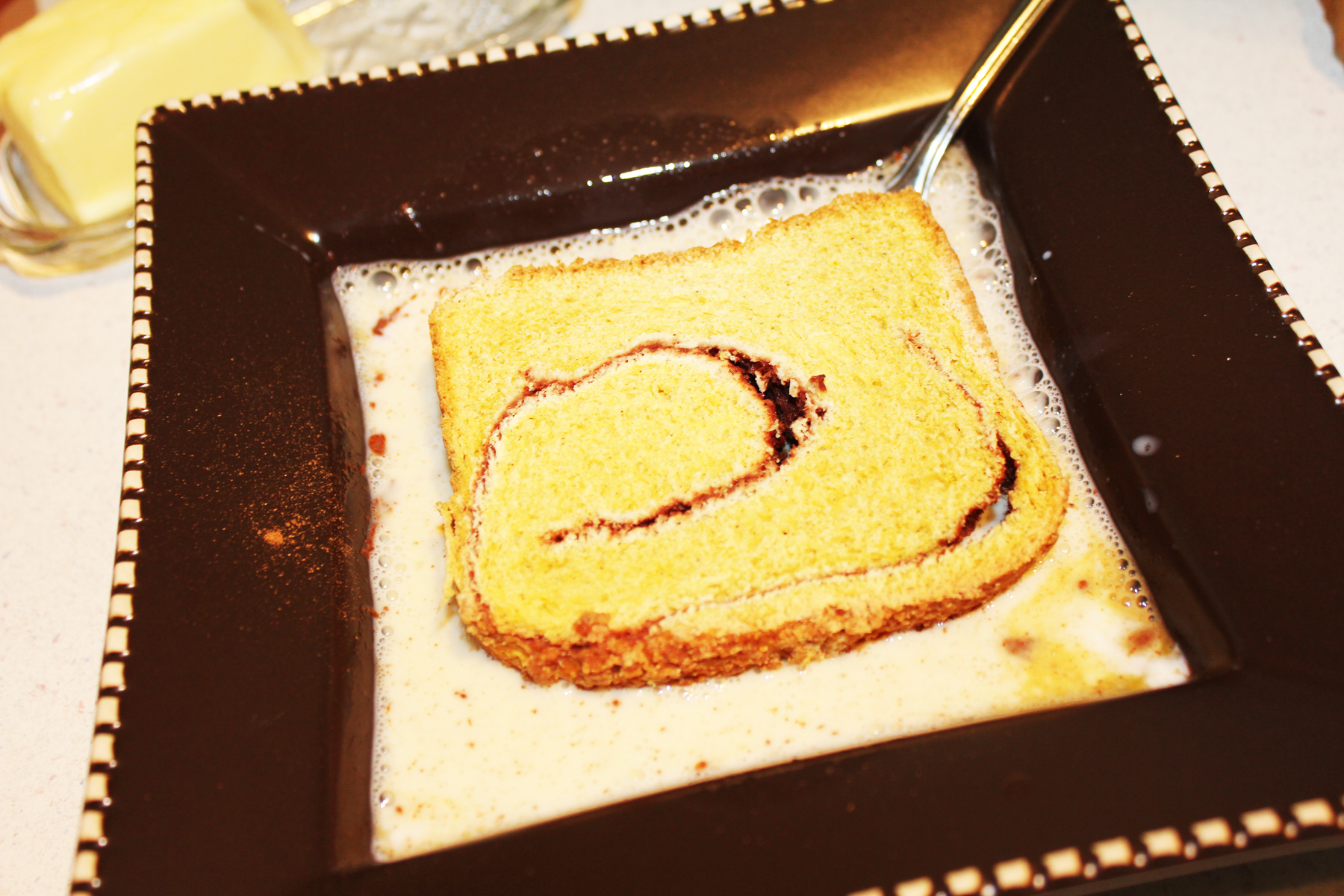 Dip bread in batter, but don’t let it soak, it will get soggy and gross in a hurry. Just dip one side, flip and do the other side.