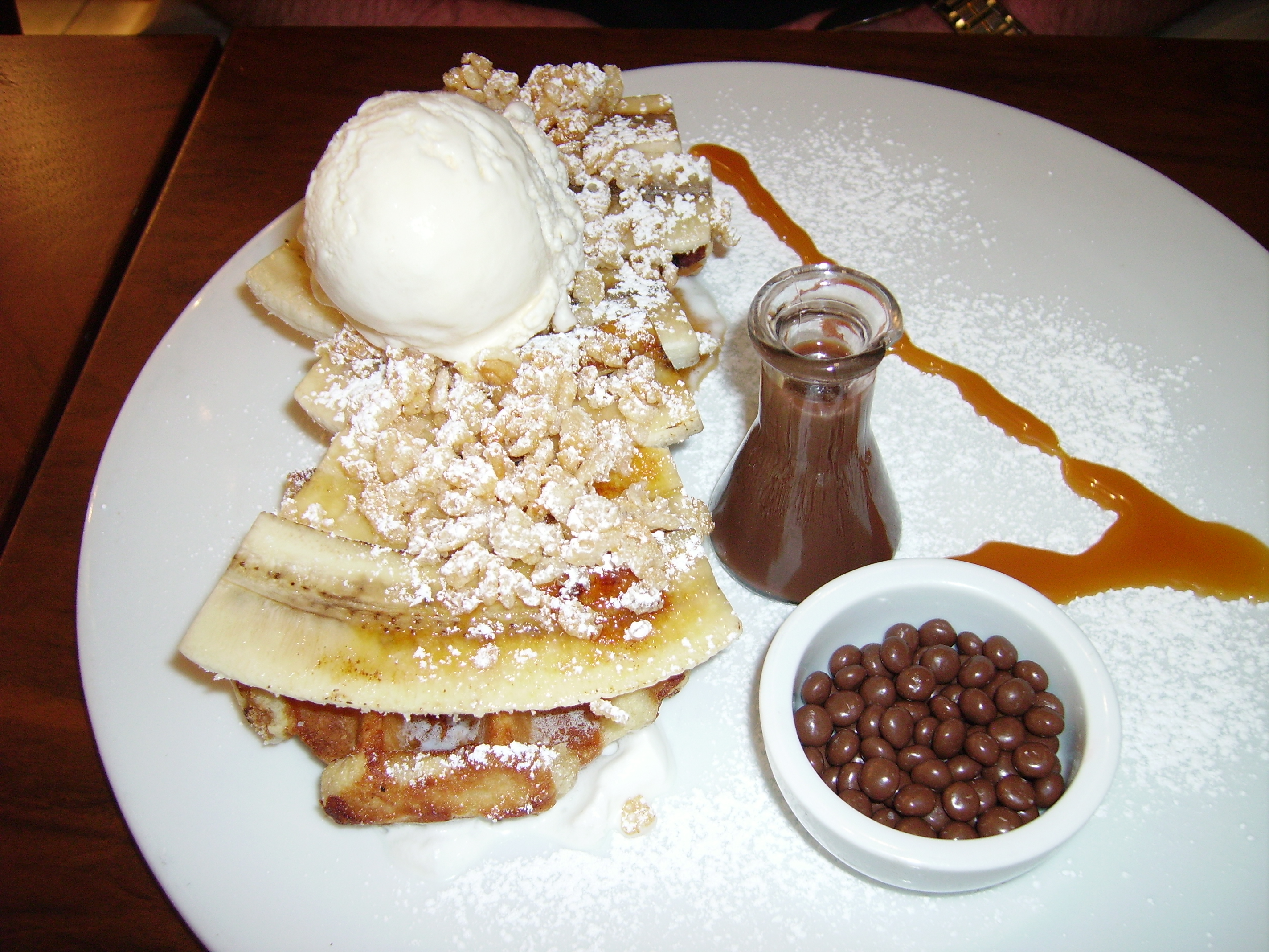 It was a plate full of warm bliss, topped with flambéd bananas, whipped cream, ice cream, chocolate covered Rice Krispies, caramel and chocolate sauce.