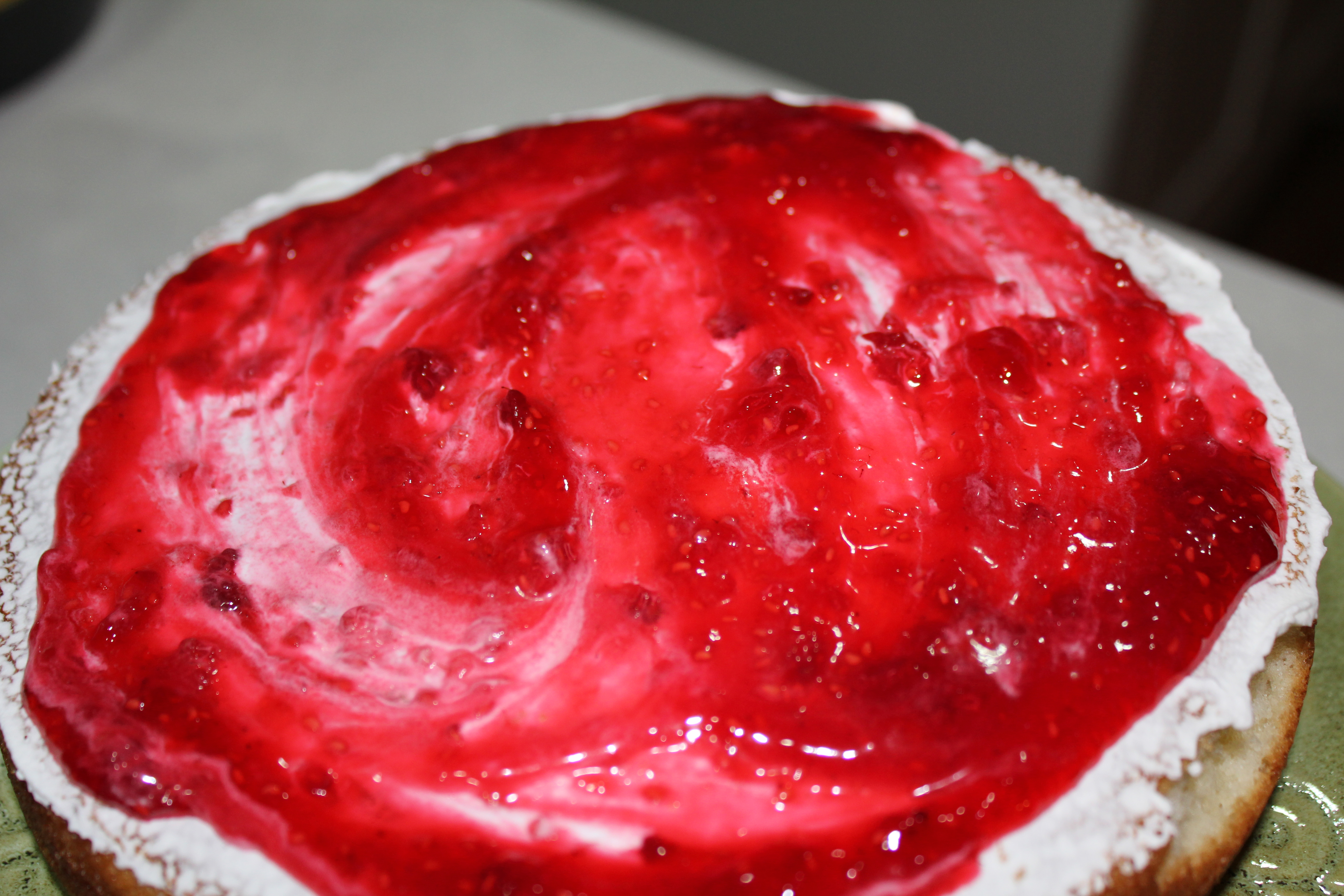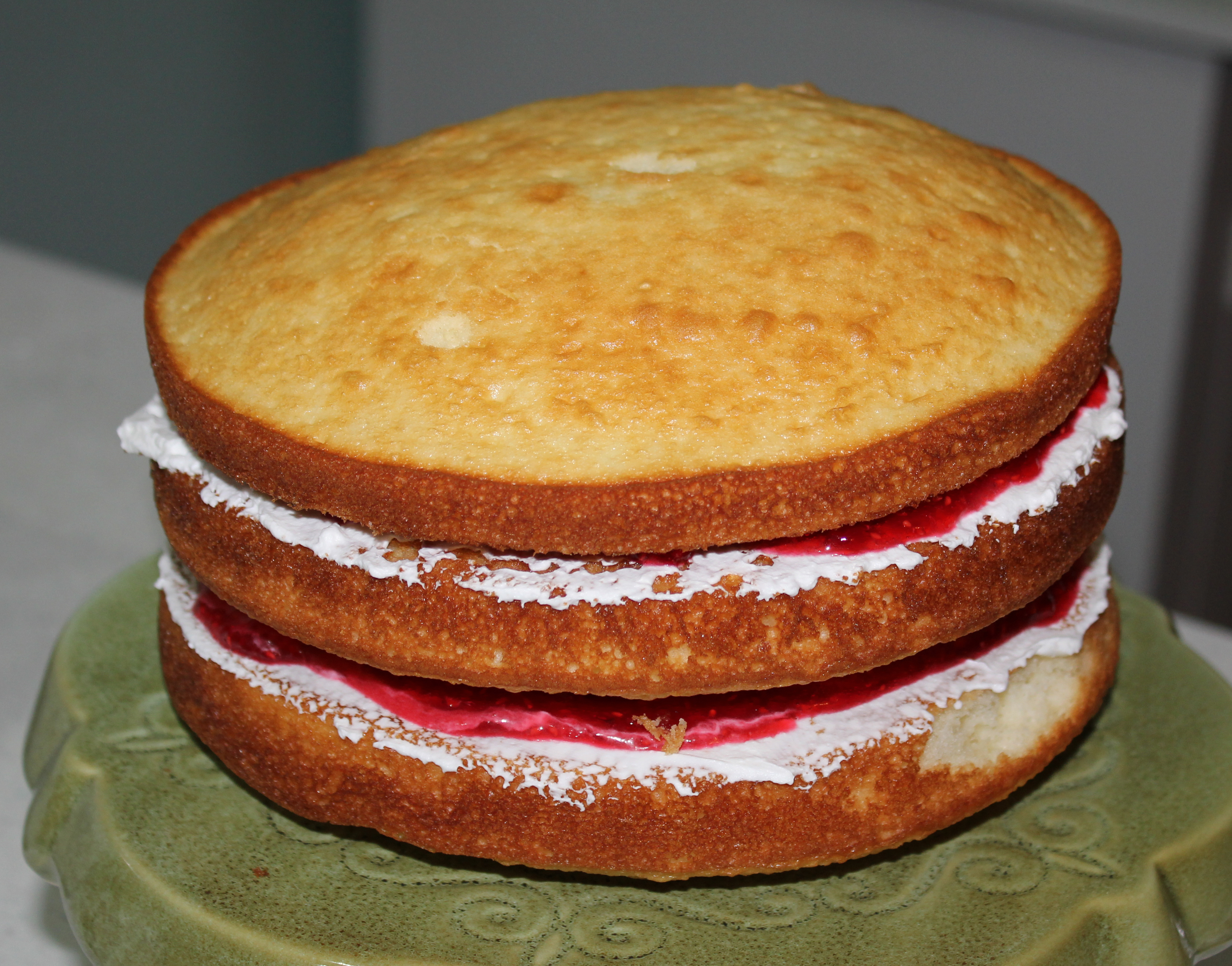 Place first layer of cake on a cake stand or serving platter. Spread a thick layer of whipping cream then a nice layer of jam. Repeat with the second layer then top with the third. Generously cover the entire cake with the whipping cream.
