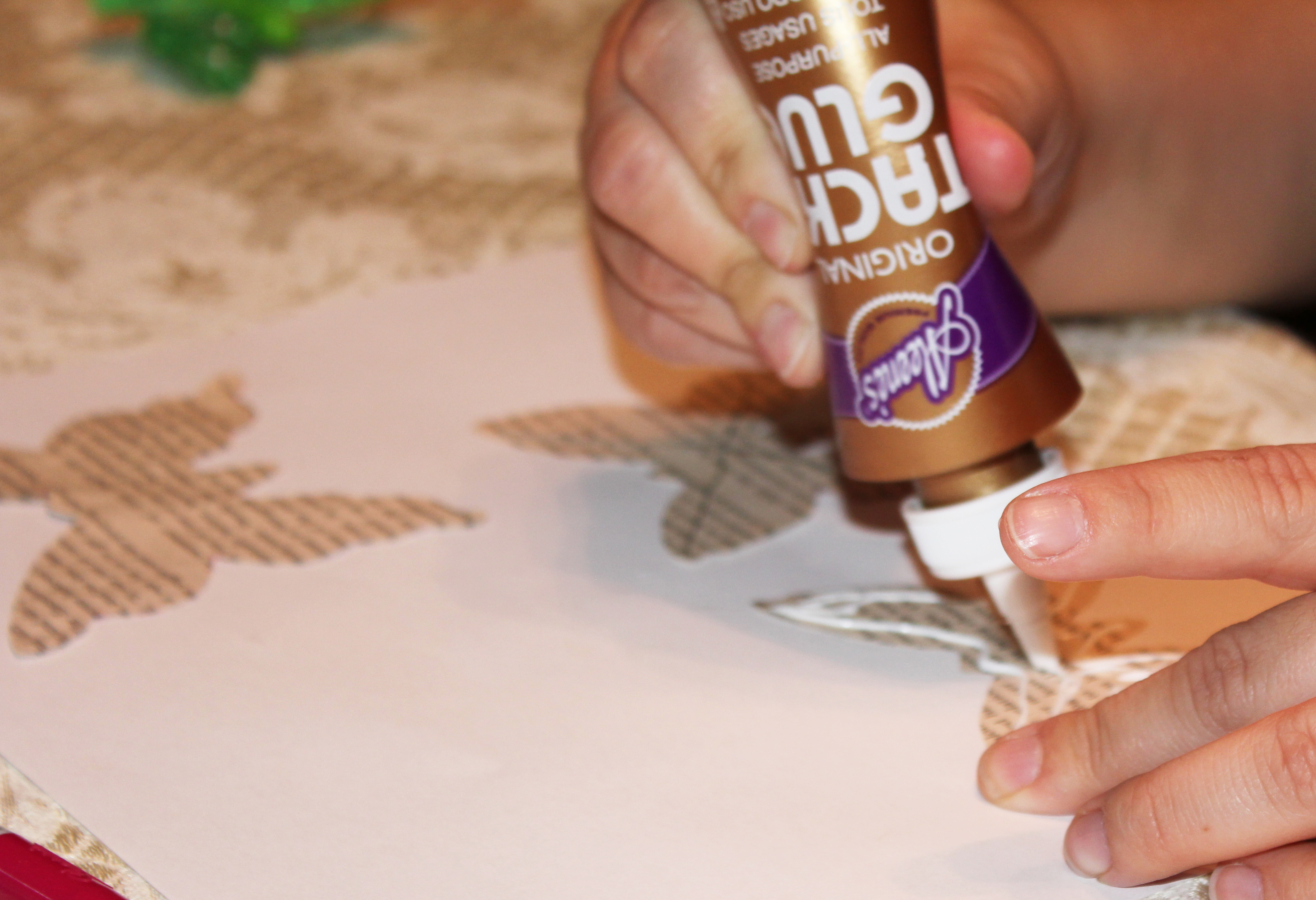Liberally apply glue to the edges of one piece of your butterfly. Place the wire on the glue then lay the top piece on top of the wire (like you were making a butterfly sandwich with the paper and glue – in other words, make sure you get the inside pieces together so the edges match up.)