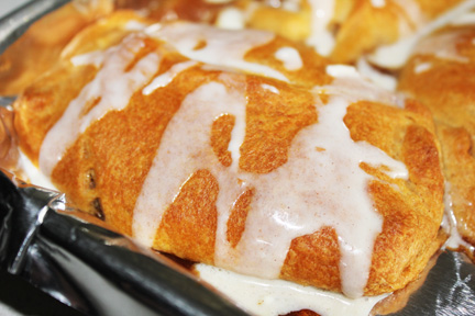 Remove from the oven. Microwave frosting for about 10 seconds and drizzle over tops of pockets.