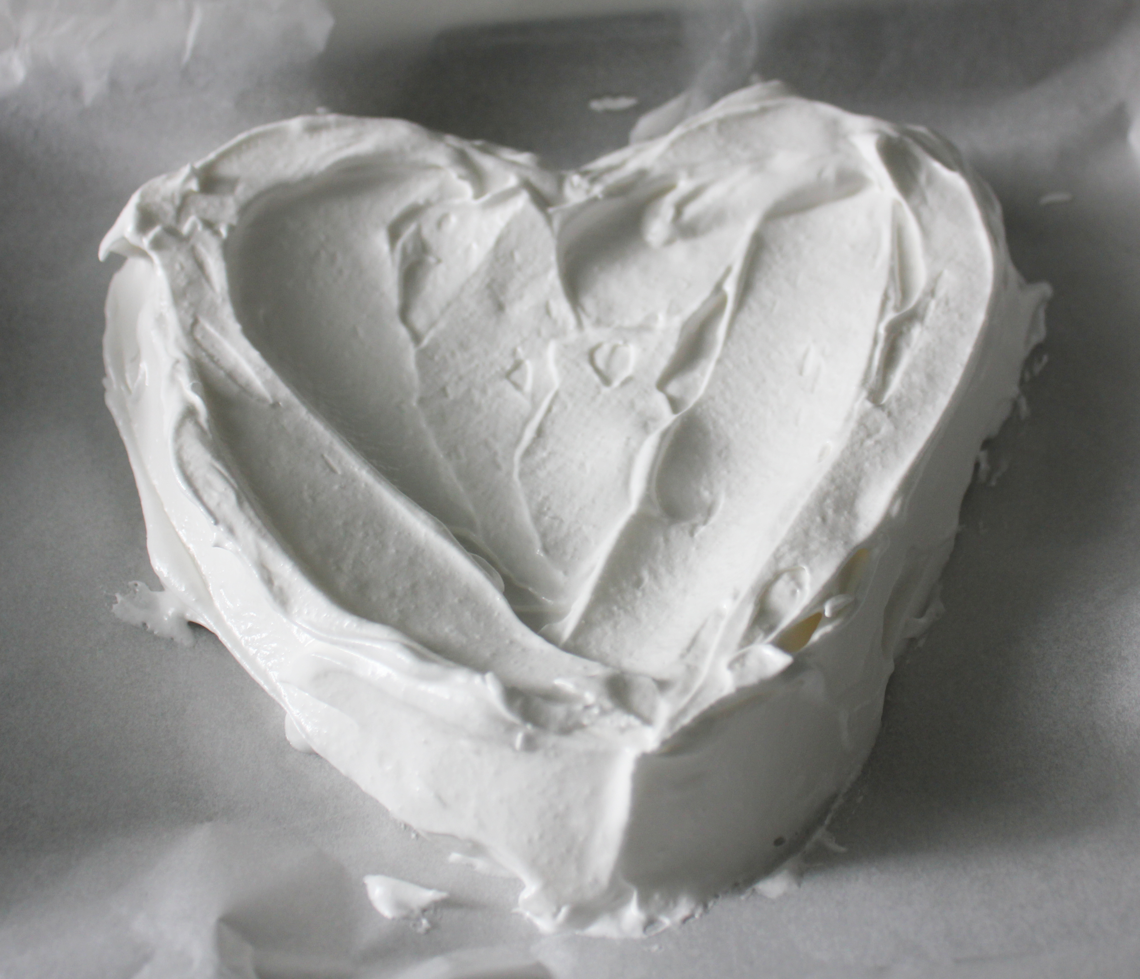 Line a baking sheet with parchment. Form a heart, using a spoon to spread out the meringue (or a circle). You want the edges to be higher than the middle.