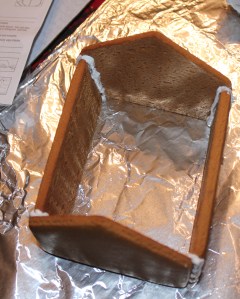 Sometimes cheating is a good thing. This kit comes with a gingerbread house and a frosting mix that serves as glue to hold everything together. It also had candy, but I set it aside, instead focusing on the candies sent by Wrigley. Captain Cavedweller found me a piece of wood to use and I wrapped the whole thing in foil to serve as a base for the project.