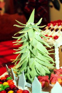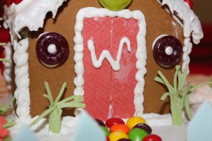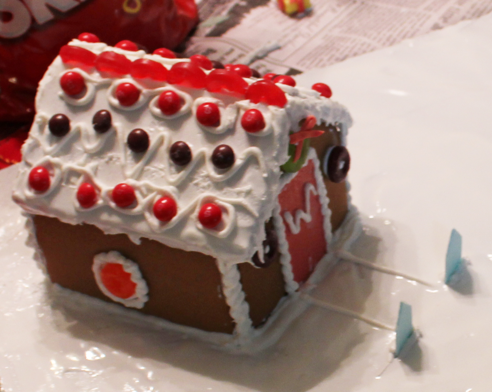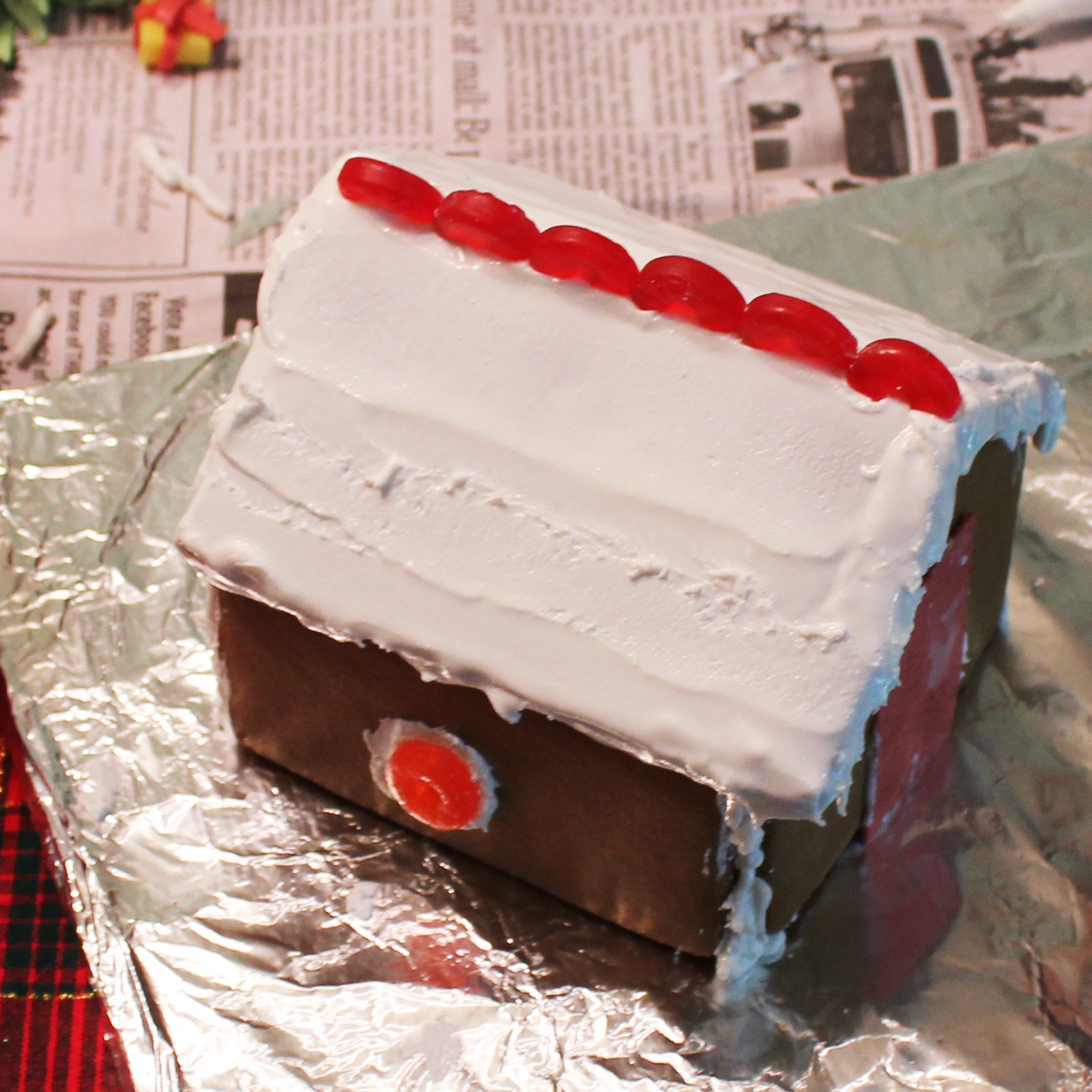 Once I got the roof stuck on, I added fruit Life Savers for windows, two sticks of Big Red for the door and then chopped Life Saver Gummies in half and marched across the top of the roof.