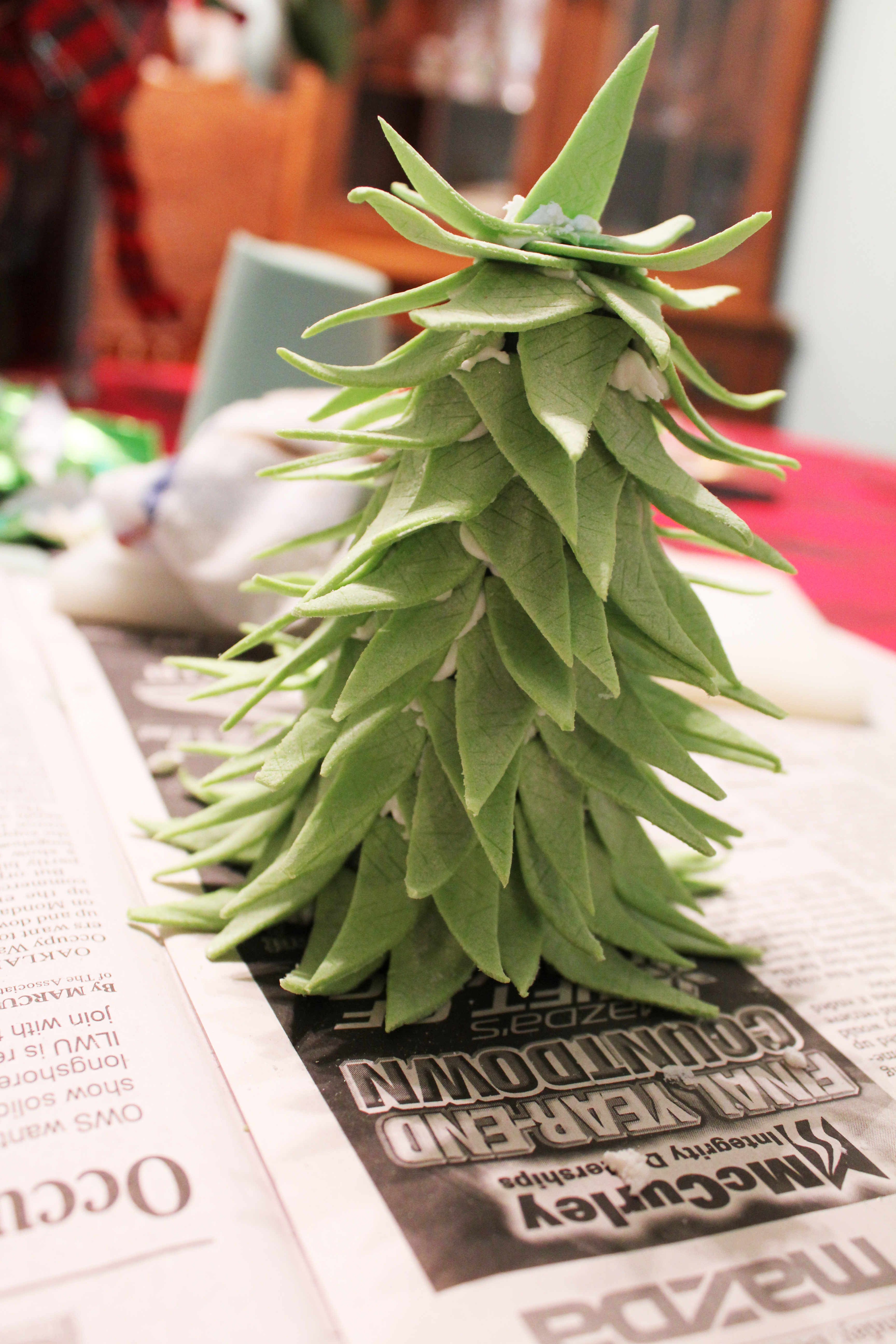 Use frosting to glue gum to a styrofoam cone. I used one about six inches tall. Just layer the triangle pieces around the cone, starting at the base and working your way to the top.
