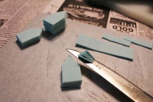 I cut the sticks of gum in half then cut a triangle at each end. I also cut a few of the halves into thin long pieces. These little sections would become the cross pieces between the pickets.