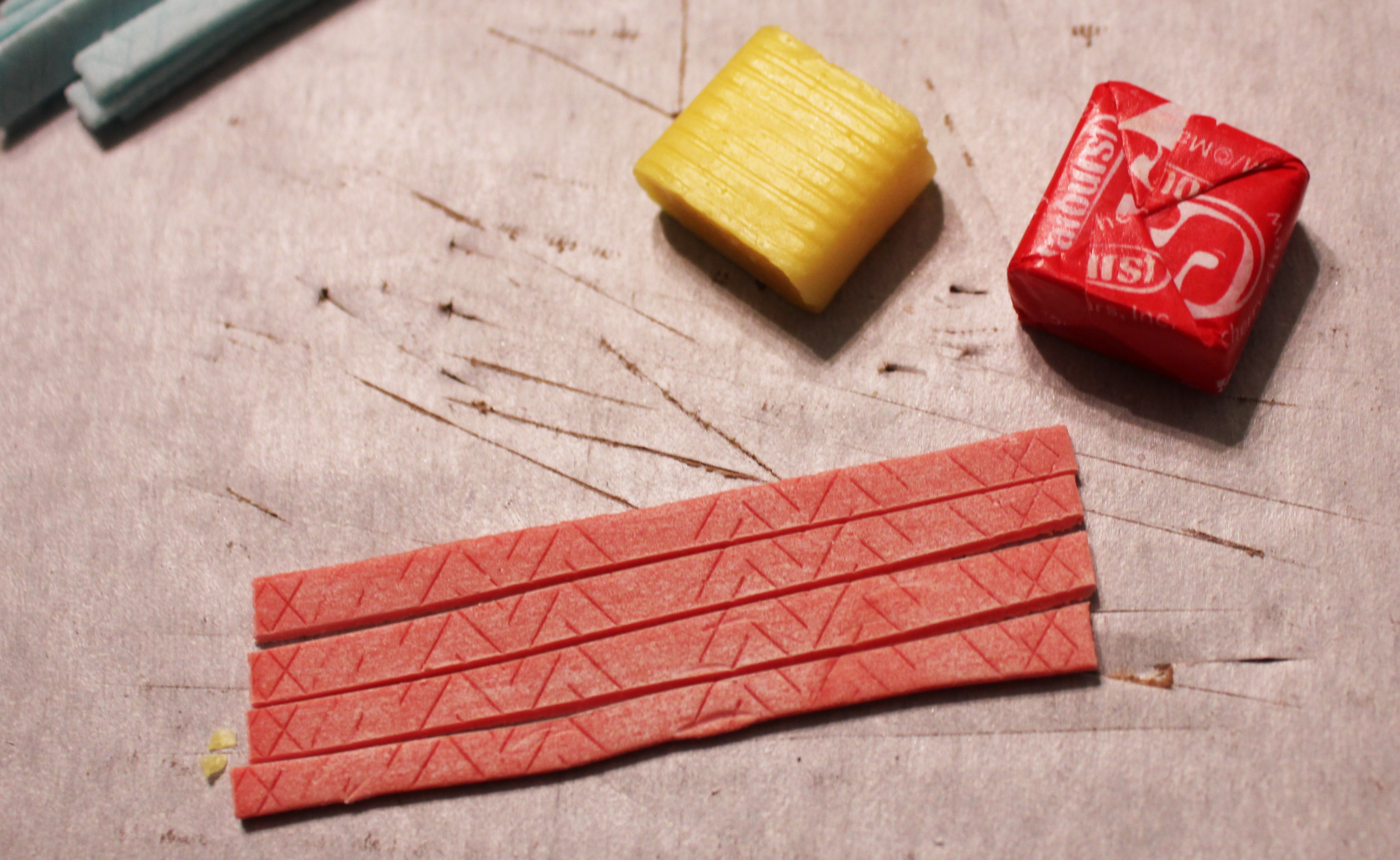 Starbursts were the perfect size for presents. I sliced a piece of Big Red Gum lengthwise into four strips to make the ribbon and bow.