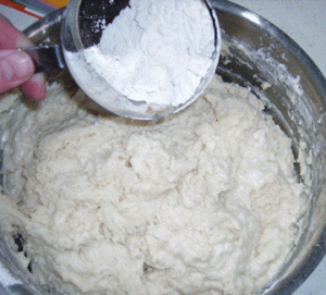 Add four cups of the flour and stir until just combined. It is going to be sticky. Cover with a tea towel and set in a warm place for an hour.