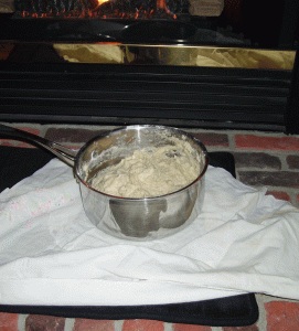 Place the pan in a warm area, cover with a tea towel and let the yeast do its thing for about an hour. I like to put my pan in front of the fire. It is warm and makes the dough smell heavenly.