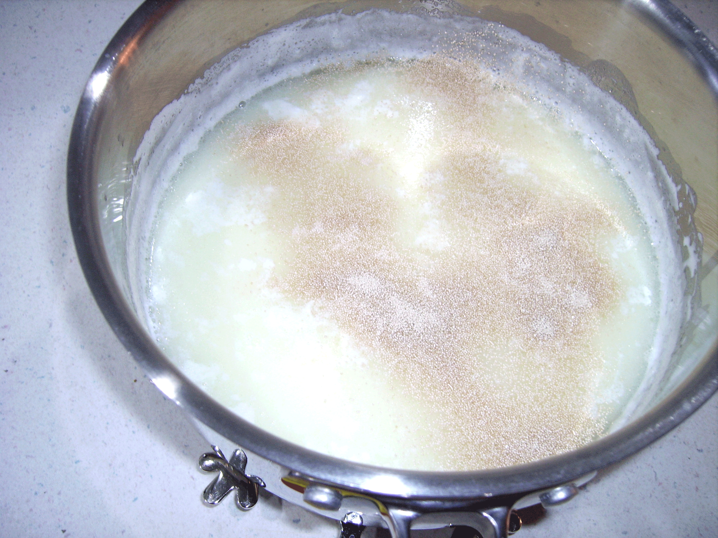 Once the milk mixture has cooled to lukewarm, you can add in a package of yeast.